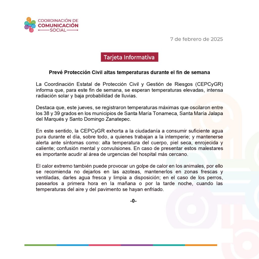 La Coordinación Estatal de Protección Civil y Gestión de Riesgos (CEPCyGR) informa que, para este fin de semana, se esperan temperaturas elevadas, intensa radiación solar y baja probabilidad de lluvias.