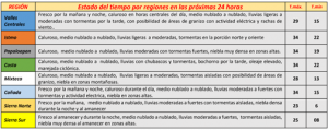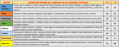 Lo anterior, se prevé con posibilidad de tormentas locales fuertes con actividad eléctrica y rachas de viento en horas de la tarde-noche, con mayores acumulados en zonas montañosas del norte del Istmo, Cuenca del Papaloapan, Sierra Norte, Sierra Mazateca y Sierra Sur, donde además hay presencia de niebla muy densa; mientras que en la línea de costa se mantiene oleaje elevado con marejadas fuertes.