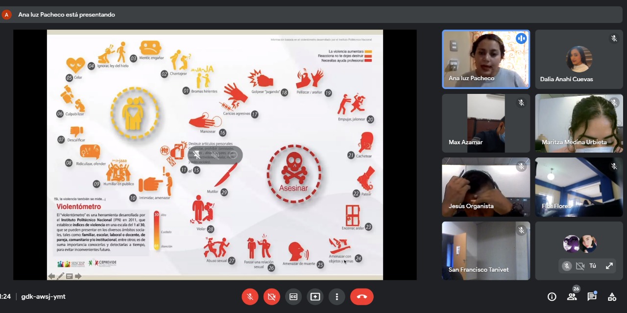 Durante el desarrollo de la plática virtual, la ponente Ana Luz Pacheco expuso las consecuencias y alcances que tiene el recurrir a la fuerza e intimidación para alcanzar un propósito, con lo que condujo al personal a la reflexión y al llamado de “ser elementos importantes en la sociedad para no pertenecer al círculo replicador de la violencia”.