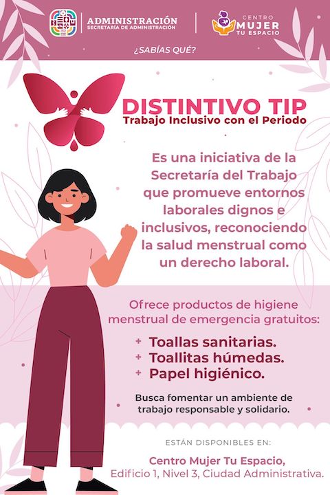 A través del Centro Mujer Tu Espacio, ubicado en el Edificio 1, nivel 3 de Ciudad Administrativa Benemérito de las Américas; la SA pone a disposición, de manera gratuita, toallas sanitarias, toallitas húmedas y papel higiénico.