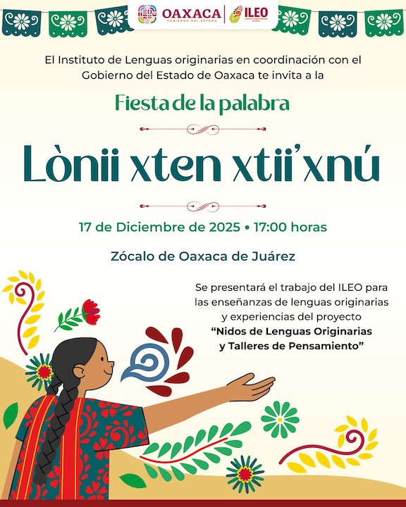 Oaxaca de Juárez, Oax., 16 de diciembre de 2025.- El Gobierno del Estado realizará el Encuentro de Aprendizajes y Saberes Lingüísticos “Lònii xten xtii’xnú – Fiesta de la Palabra”, un espacio de diálogo intercultural orientado a la socialización del pensamiento y las lenguas originarias.