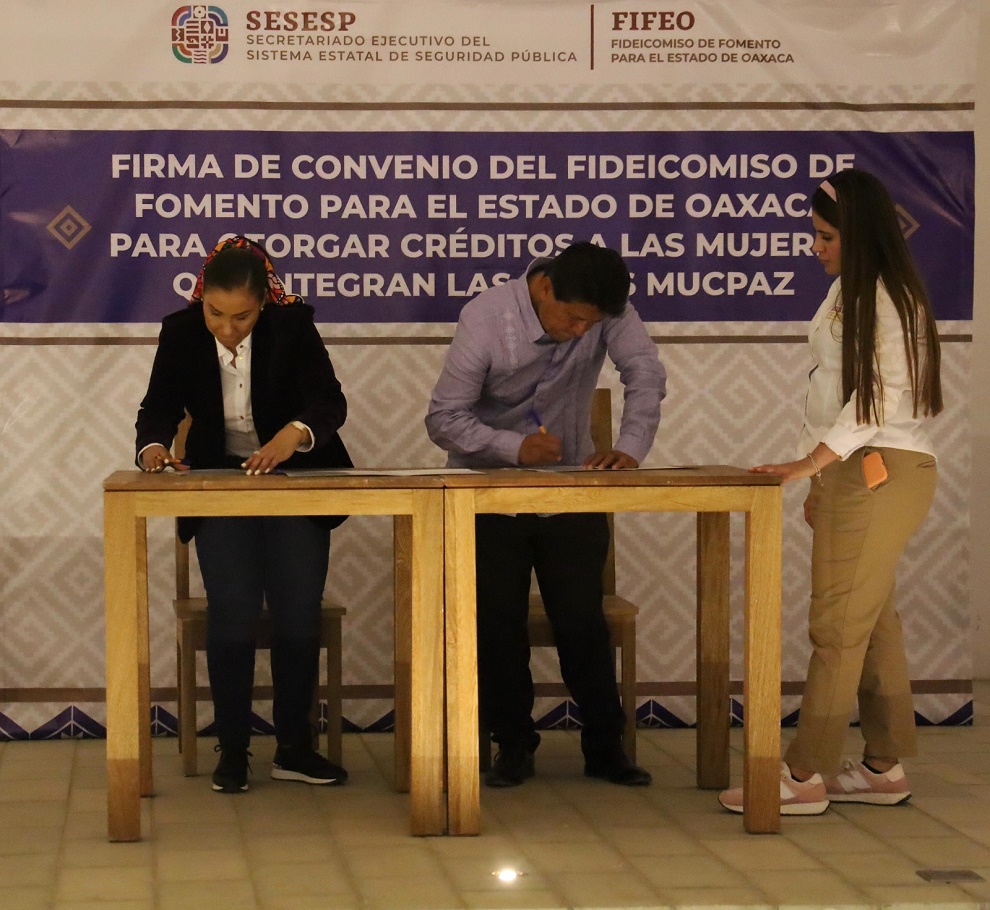 Oaxaca de Juárez, Oax. 9 de febrero de 2024.- El Secretariado Ejecutivo del Sistema Estatal de Seguridad Pública (SESESP) firmó un convenio de colaboración con el Fideicomiso para el Fomento del Estado de Oaxaca (Fifeo), para la promoción y operación de programas prioritarios de inclusión financiera y acceso al financiamiento para mujeres oaxaqueñas.