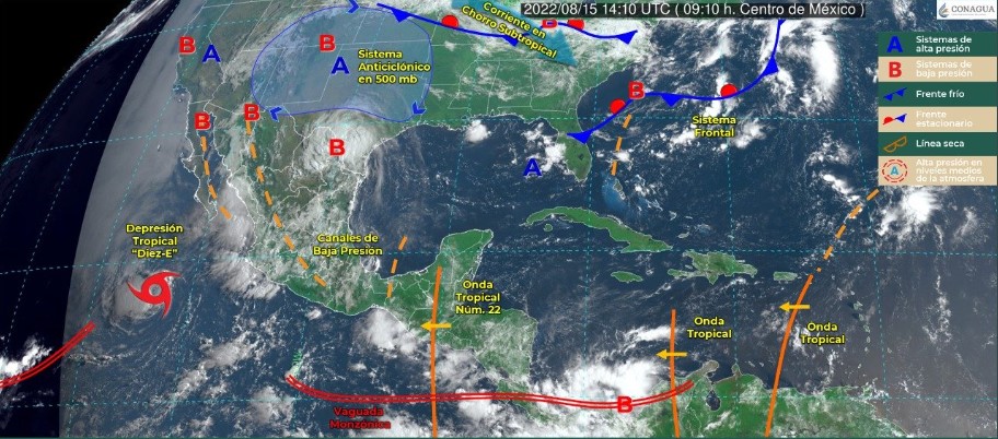 Oaxaca de Juárez, Oax. 15 de agosto de 2022. La Coordinación Estatal de Protección Civil de Oaxaca (CEPCO) informó que para este inicio de semana la interacción de la onda tropical número 22, que se ubica al sur de México y se desplaza hacia el oeste a una velocidad promedio de 20 kilómetros por hora podría alcanzar en las próximas 24 horas los estados del sur de Oaxaca y Guerrero con un canal de baja presión, lo que provocará desarrollos convectivos que mantendrán la presencia de lluvias moderadas a fuertes en gran parte el territorio oaxaqueño.