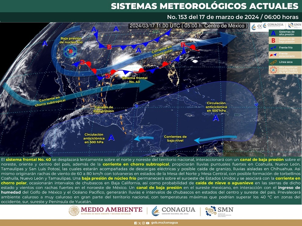 Lo anterior, de acuerdo con el pronóstico emitido por la Comisión Nacional del Agua (Conagua) que señala que la presencia de un canal de baja presión sobre el sureste de México en interacción con la corriente en chorro subtropical.