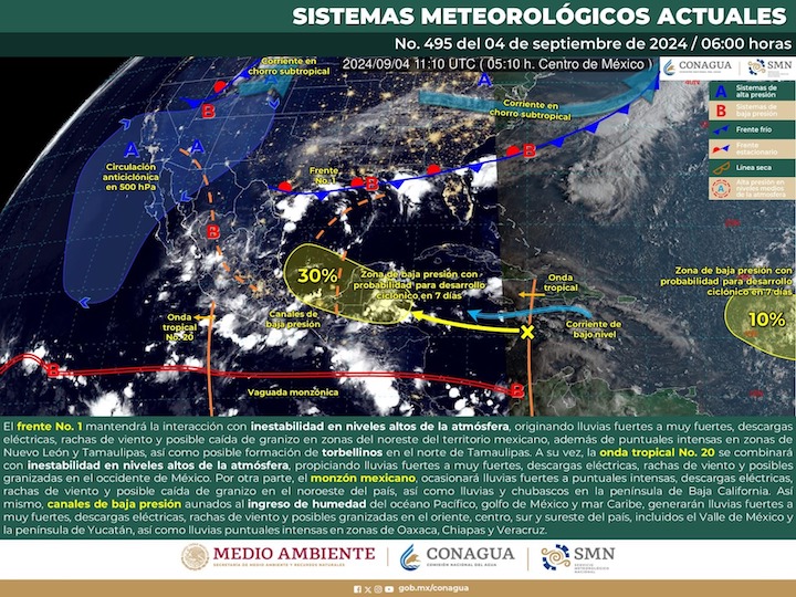 De acuerdo con el pronóstico del tiempo emitido por la Comisión Nacional del Agua (Conagua), las condiciones meteorológicas serán inestables debido a la permanencia de un canal de baja presión y la entrada de humedad del Océano Pacífico, favoreciendo el desarrollo de nublados densos y lluvias después del mediodía.