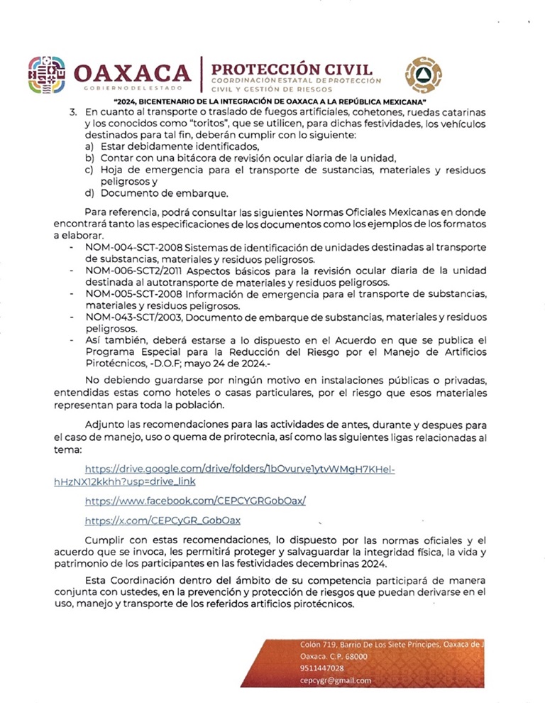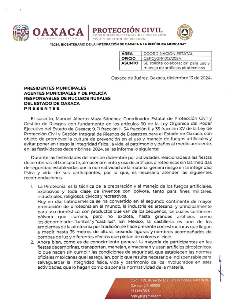 Al inicio de la temporada decembrina, la CEPCyGR giró un oficio a las autoridades municipales, agentes municipales y de policía, así como responsables de núcleos rurales de las ocho regiones, para que en la medida de sus responsabilidades realicen las acciones preventivas necesarias para evitar accidentes por la venta y uso de estos fuegos artificiales.