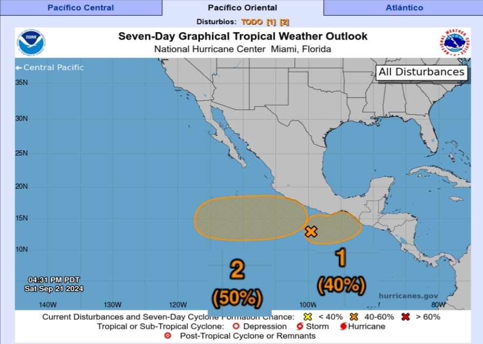 De acuerdo con el pronóstico del tiempo emitido por la Comisión Nacional del Agua (Conagua), dos bajas presiones con potencial para desarrollo ciclónico de 40 y 50 por ciento a 7 días se ubican sobre el Pacífico Sur, inmersas en la vaguada monzónica, además se suma la onda tropical número 24, generando inestabilidad sobre la mayor parte del estado.