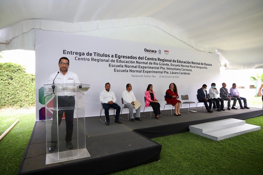 Oaxaca de Juárez, Oax. 26 de octubre de 2022.- El Instituto Estatal de Educación Pública de Oaxaca (IEEPO), inició la entrega 555 títulos profesionales electrónicos a egresados del Centro Regional de Educación Normal de Oaxaca (CRENO), del Centro Regional de Educación Normal de Río Grande (CRENRIO); de la Escuela Normal Rural Vanguardia (ENRUVA); la Escuela Normal Experimental “Presidente Venustiano Carranza” (ENEVC) y la Escuela Normal Experimental “Presidente Lázaro Cárdenas” (ENELC).