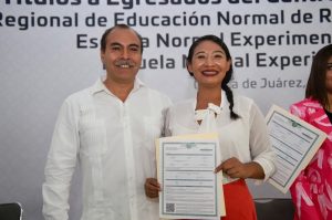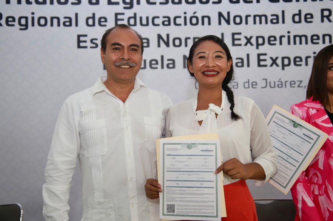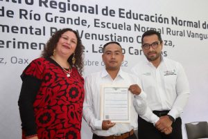 En una emotiva ceremonia, a nombre del director general del IEEPO, José Luis Rangel, el titular de la Unidad de Educación Normal y Formación de Docentes, Carlos Alberto Cuevas Cervantes, felicitó y reconoció la entrega, esfuerzo y compromiso que mostraron las y los profesionistas. “Un título no solo es un papel, sino que lleva en sí el compromiso de ser profesionales con conocimientos y habilidades para el ejercicio más competente de la profesión”, dijo.
