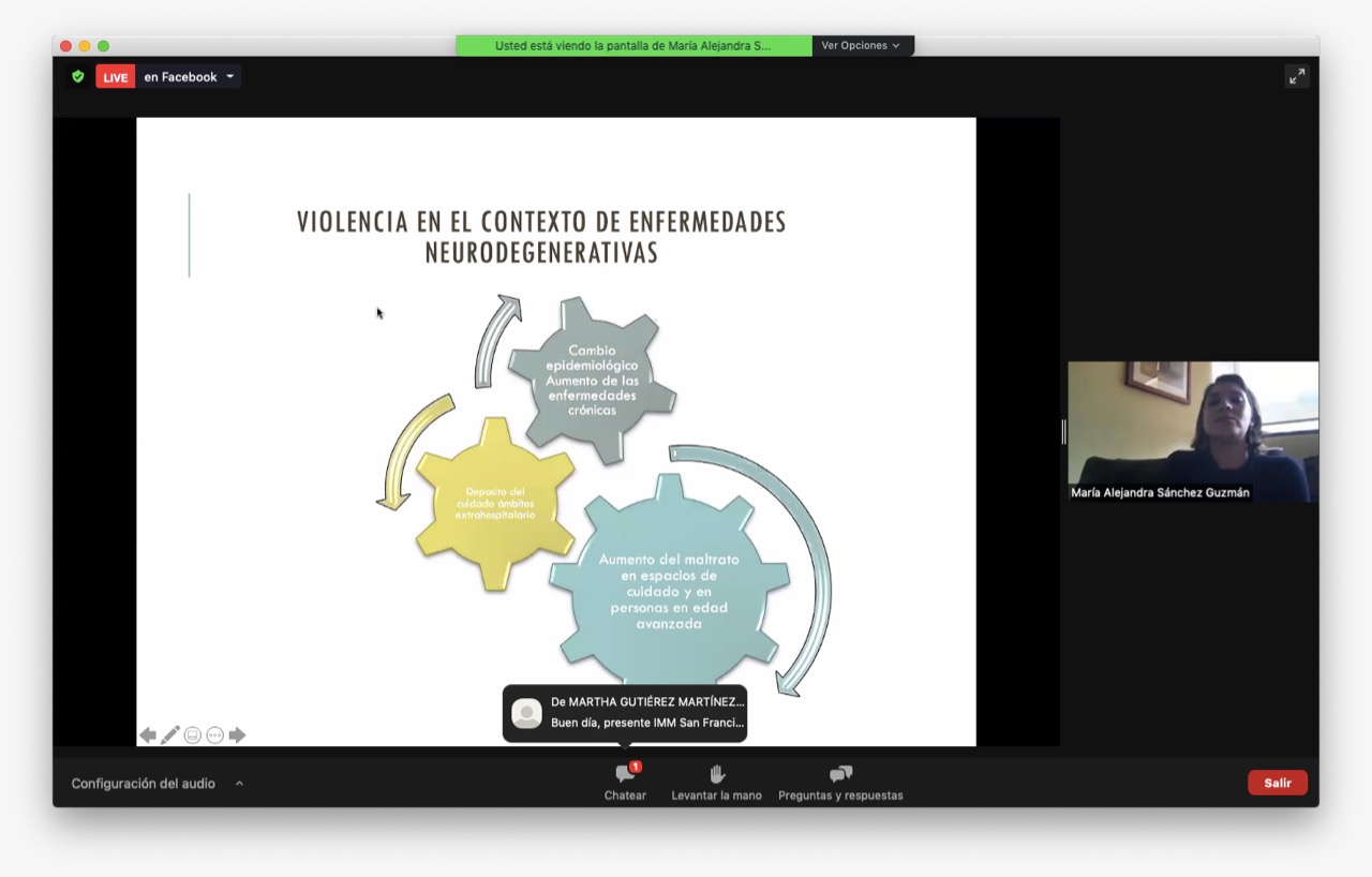 Señaló también la ponente que las mujeres adultas mayores suelen padecer polivictimización, pues son violentadas por sus hijas e hijos, por su pareja o cualquier persona de convivencia en el mismo espacio físico. Además, describió con testimonios, la violencia en contextos de enfermedad y desde la investigación cómo se ha abordado en la historia reciente.