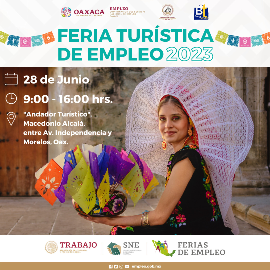 La Feria del Empleo Turística Oaxaca 2023 se realizará en el Andador Turístico del Centro Histórico de la ciudad de Oaxaca de Juárez, entre las avenidas Independencia y Morelos, en la que participarán 50 empresas y se espera atender a 550 solicitantes.