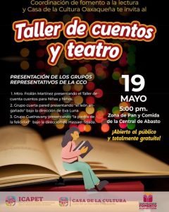 Oaxaca de Juárez, Oax., 19 de mayo de 2023.- Este viernes, la Casa de la Cultura Oaxaqueña y la Coordinación de Fomento a la Lectura realizarán el Taller de Cuentos y Teatro, en la zona de pan y comida de la Central de Abasto.