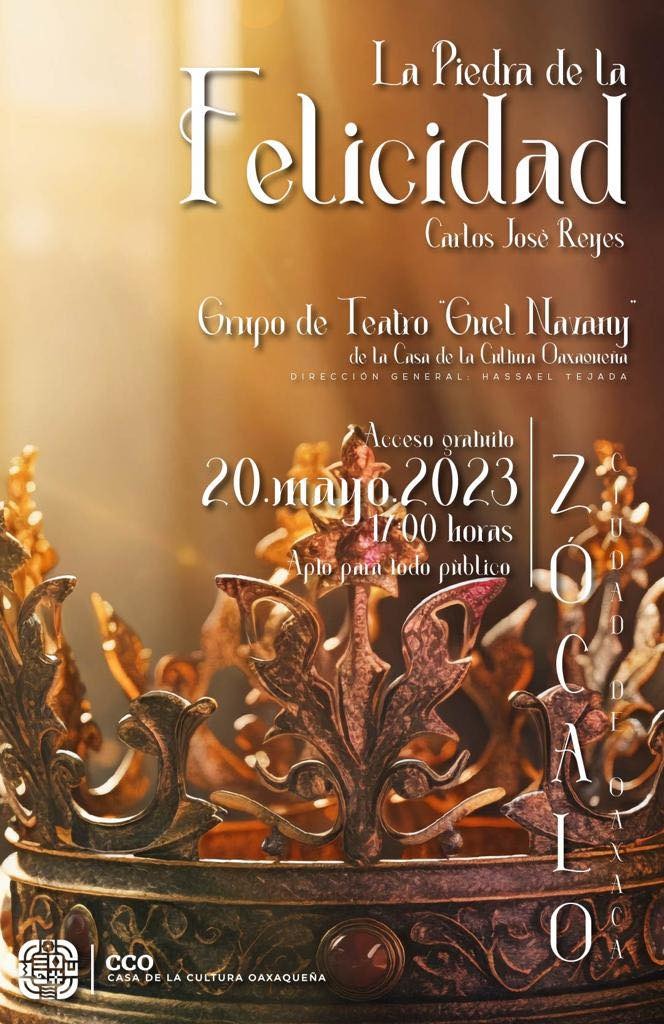 Finalmente señaló que la obra “La piedra de la felicidad”, del autor Carlos José Reyes, se presentará de nueva cuenta este sábado 20 de mayo a las 17:00 horas en las instalaciones de la CCO, ubicadas en la calle González Ortega número 403 en el centro de la capital oaxaqueña.