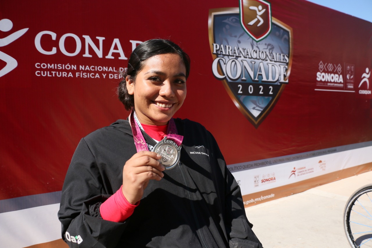 Hermosillo, Sonora. 19 de noviembre de 2022.- La paraatleta Rebeca Citlaly Cortés Montaño, se colgó la medalla de plata en la prueba de lanzamiento de disco, categoría juvenil superior 19- 21 años F54, en el inicio del tercer bloque de los Paranacionales Conade 2022 que se realizan en esta ciudad.