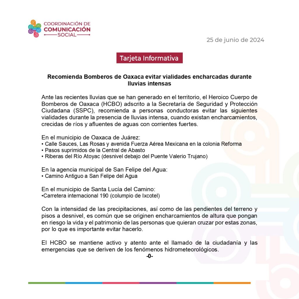 Ante las recientes lluvias que se han generado en el territorio, el Heroico Cuerpo de Bomberos de Oaxaca (HCBO) adscrito a la Secretaría de Seguridad y Protección Ciudadana (SSPC), recomienda a personas conductoras evitar las siguientes vialidades durante la presencia de lluvias intensa, cuando existan encharcamientos, crecidas de ríos y afluentes de aguas con corrientes fuertes.