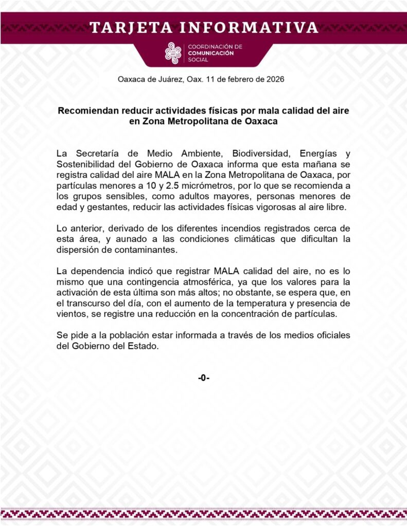 La Secretaría de Medio Ambiente, Biodiversidad, Energías y Sostenibilidad del Gobierno de Oaxaca informa que esta mañana se registra calidad del aire MALA en la Zona Metropolitana de Oaxaca, por partículas menores a 10 y 2.5 micrómetros, por lo que se recomienda a los grupos sensibles, como adultos mayores, personas menores de edad y gestantes, reducir las actividades físicas vigorosas al aire libre.
