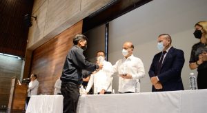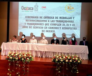 Oaxaca de Juárez, Oax. 29 de octubre de 2021.- Con la representación del gobernador Alejandro Murat Hinojosa, el Director General de Caminos y Aeropistas de Oaxaca (CAO), David Mayrén Carrasco, acompañado por el secretario general del Sindicato Único de Trabajadores de Caminos y Aeropistas de Oaxaca, Rafael Vásquez Miguel entregaron medallas de oro y plata por años de servicio a la base trabajadora.