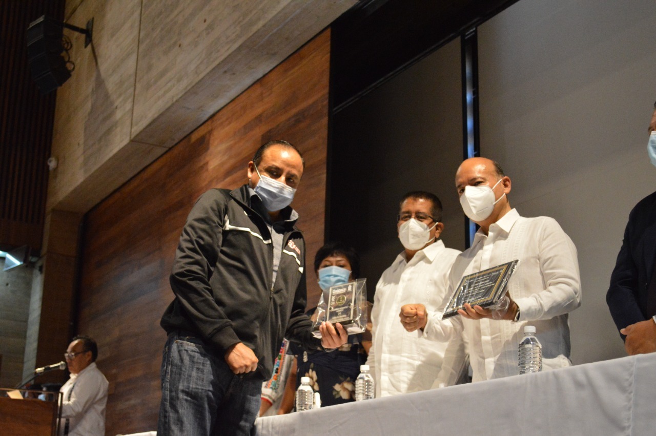 Oaxaca de Juárez, Oax. 29 de octubre de 2021.- Con la representación del gobernador Alejandro Murat Hinojosa, el Director General de Caminos y Aeropistas de Oaxaca (CAO), David Mayrén Carrasco, acompañado por el secretario general del Sindicato Único de Trabajadores de Caminos y Aeropistas de Oaxaca, Rafael Vásquez Miguel entregaron medallas de oro y plata por años de servicio a la base trabajadora.