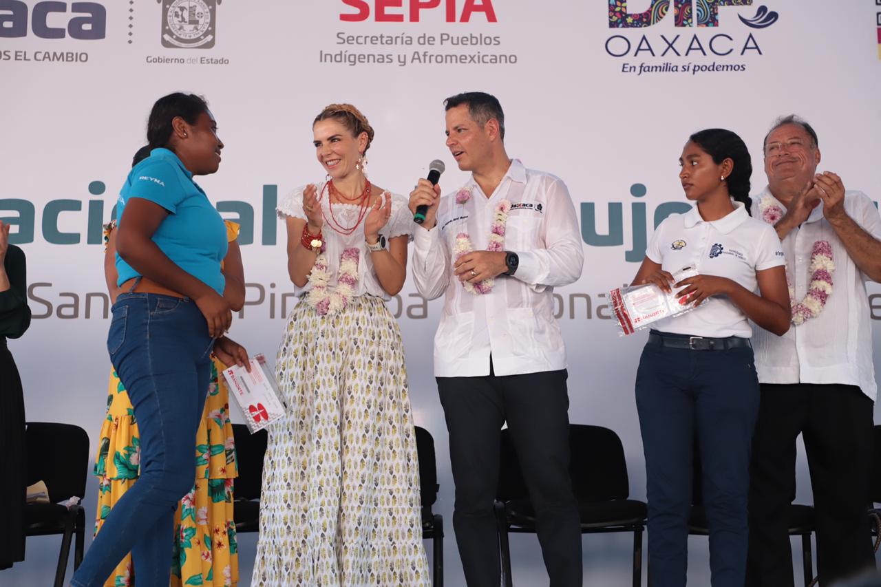 En este acto el Registro Civil otorgó dos mil actas de nacimiento gratuitas; en tanto que el Instituto de la Juventud del Estado de Oaxaca (Injeo), entregó 34 tabletas a jóvenes estudiantes destacados. De igual manera, la Comisión Estatal de Cultura Física y Deporte (Cecude) entregó material deportivo en beneficio de seis mil deportistas integrados en las ligas municipales de mujeres afrodescendientes.