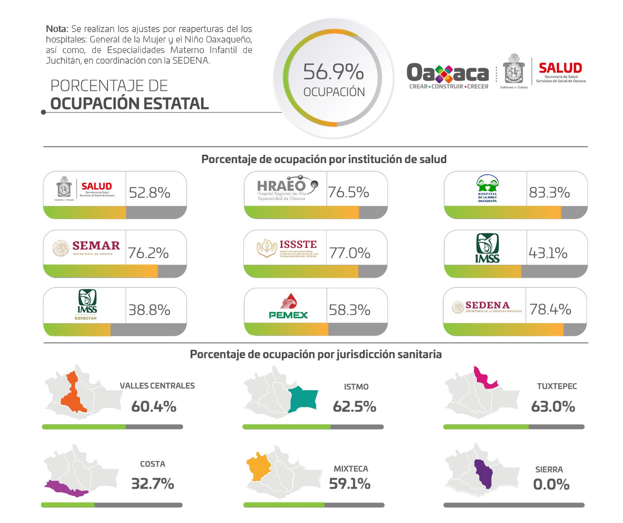 En este último corte son 11 los nosocomios que se encuentra 100% de saturación médica. Por Jurisdicción Sanitaria: Valles Centrales registra el 60.4%, Istmo 62.5%, Tuxtepec 63%, Costa 32.7%, Mixteca 59.1% y la Sierra no presenta pacientes hospitalizados.