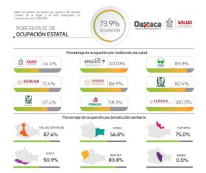 En relación a la ocupación hospitalaria, destaca la Jurisdicción Sanitaria de Valles Centrales con 87.6%, seguido de la Mixteca con 83.8%, Tuxtepec con el 75%, Istmo 56.8%, Costa 50.9% y Sierra 0%, lo que eleva a 73.9% la saturación global de la red médica, debido a que hay, 17 hospitales al 100% de ocupación, 19 nuevos hospitalizados, 362 camas están ocupadas de un total de 490.