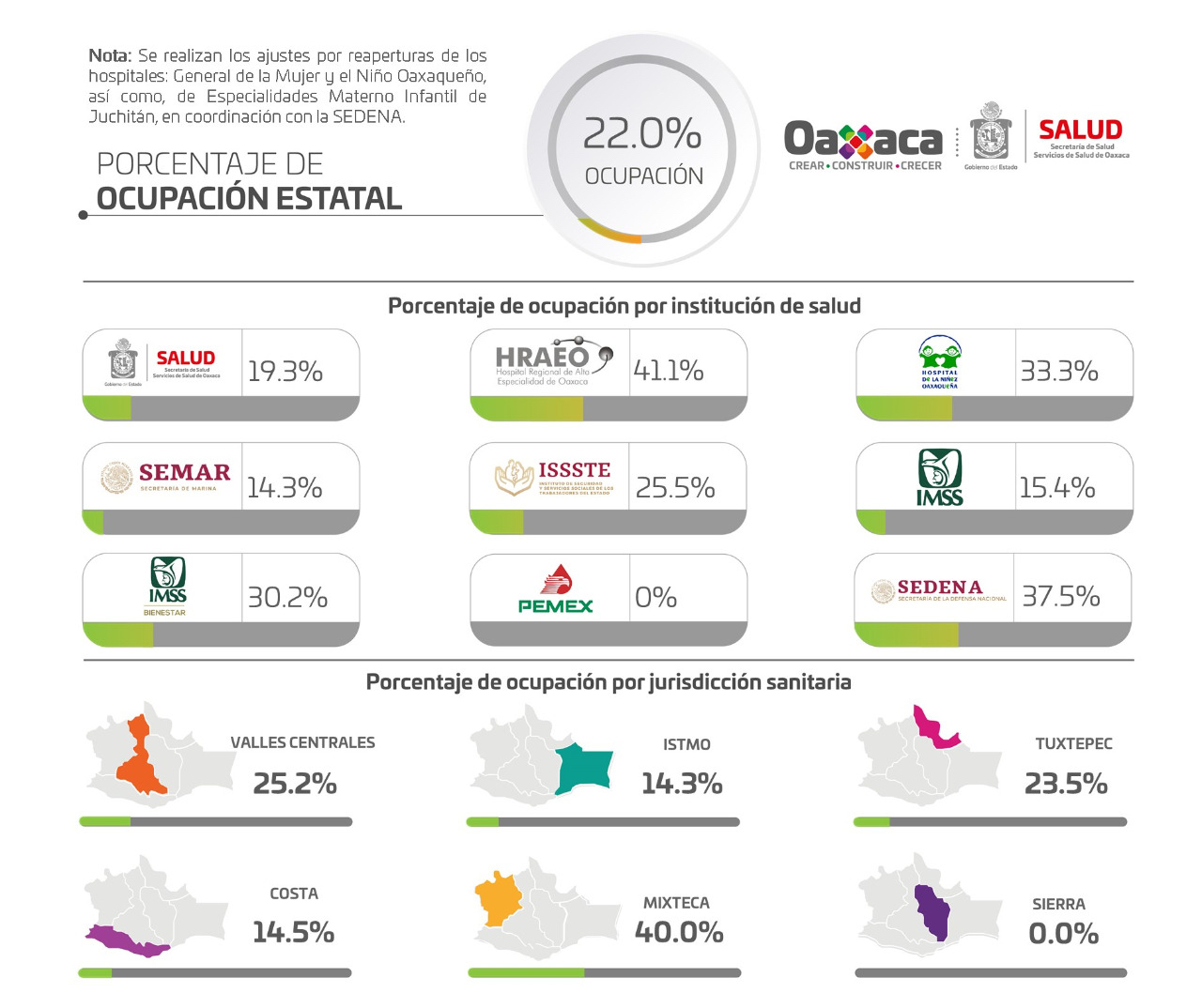 Las jurisdicciones sanitarias de la Mixteca se encuentran con un 40%, Valles Centrales con 25.2%, Tuxtepec con 23.5%, Costa 14.5%, Istmo 14.3% y Sierra 0%.