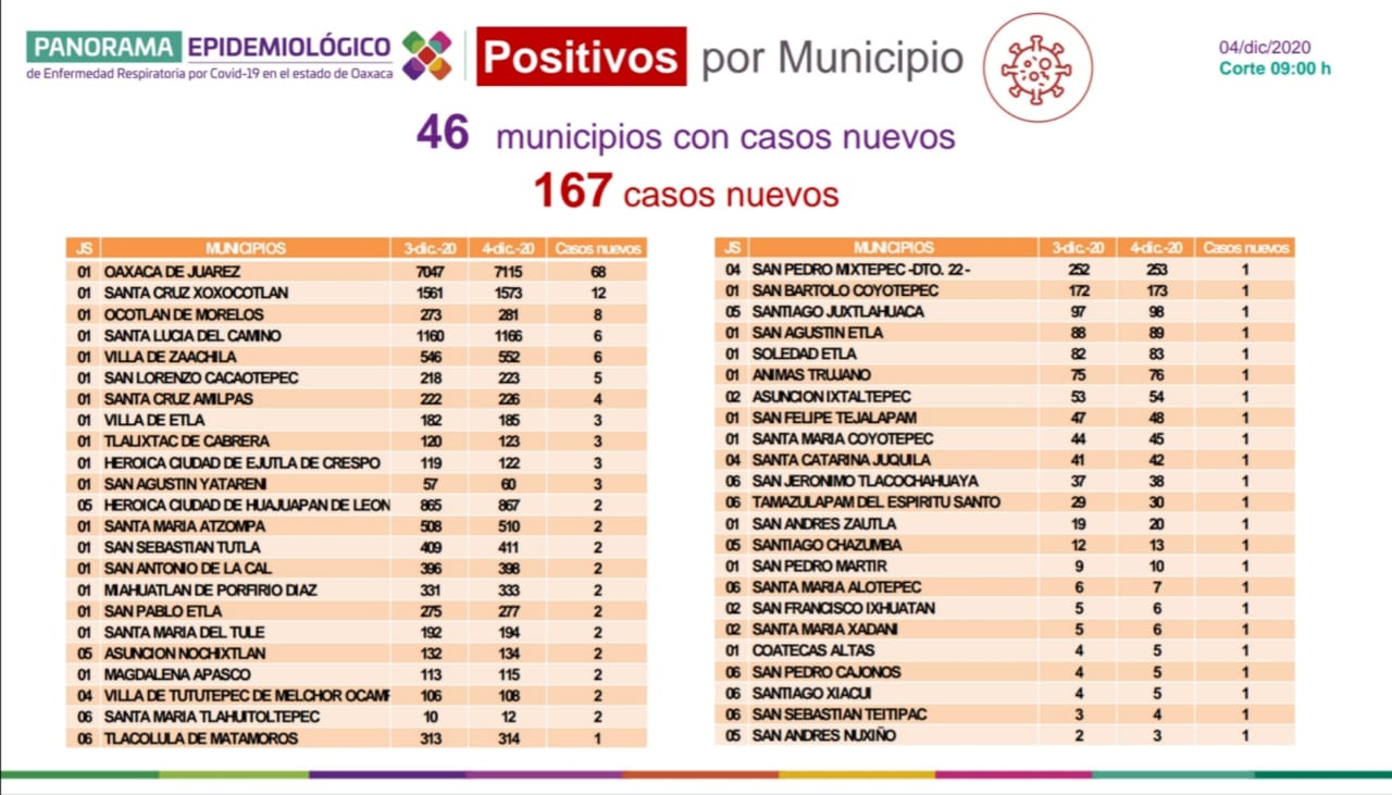 Puntualizó que de los 167 casos nuevos, se registran en 46 municipios siendo los que mayor número de casos presenta el de Oaxaca de Juárez con 68, Santa Cruz Xoxocotlán 12, Ocotlán de Morelos ocho, Santa Lucía del Camino y Villa de Zaachila seis cada uno, San Lorenzo Cacaotepec cinco, Santa Cruz Amilpas cuatro, el resto tres, dos y un caso.