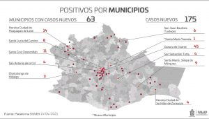 Señaló que los 175 casos nuevos se ubican en 63 municipios, siendo los que mayor número de casos presentan: Oaxaca de Juárez con 45, Huajuapan de León 14, Santa Cruz Xoxocotlán 11, Santa María Jalapa del Marqués nueve, Santa Lucía del Camino ocho, San Juan Bautista Tuxtepec seis, el resto cuatro, tres, dos y un caso.