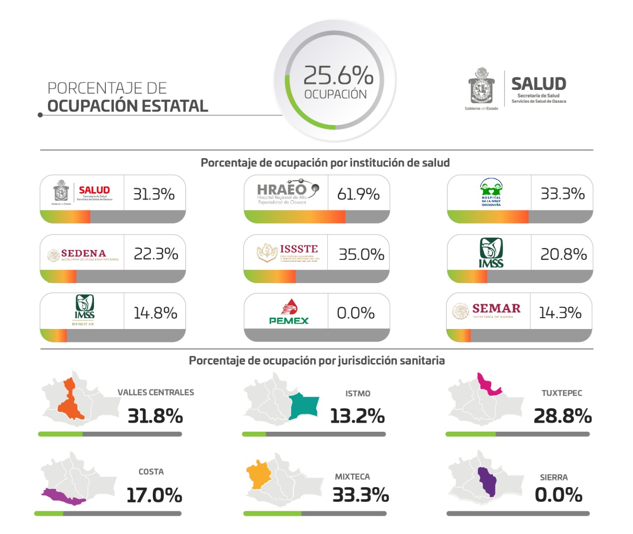 Destacó que la Jurisdicción Sanitaria número uno Valles Centrales registra 30 mil 672 casos confirmados y mil 778 defunciones, Istmo tres mil 694 y 529 defunciones, Tuxtepec dos mil 921 y 338 defunciones, Costa dos mil 226 y 230 defunciones, Mixteca tres mil 784 y 318 defunciones, y la Sierra mil 571 y 143 defunciones.