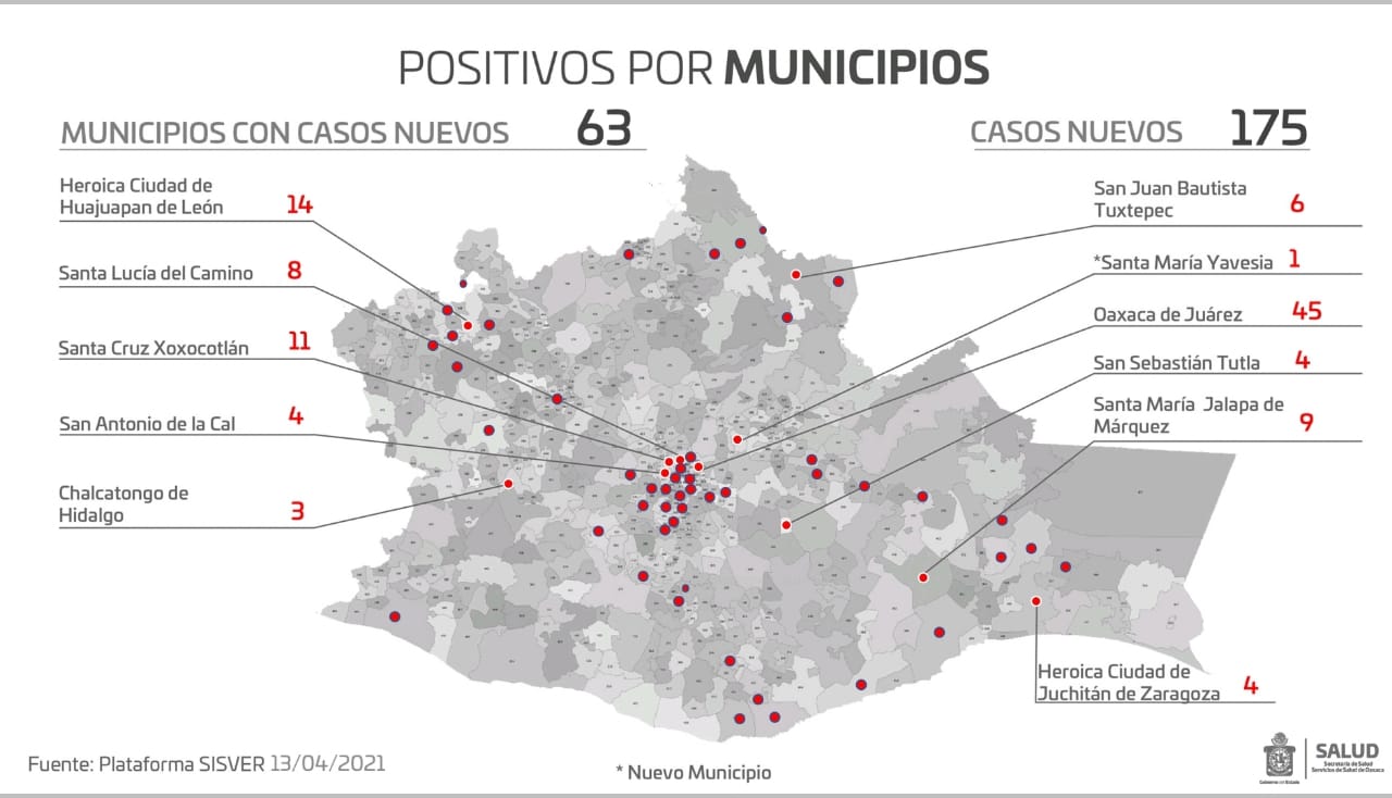 Señaló que los 175 casos nuevos se ubican en 63 municipios, siendo los que mayor número de casos presentan: Oaxaca de Juárez con 45, Huajuapan de León 14, Santa Cruz Xoxocotlán 11, Santa María Jalapa del Marqués nueve, Santa Lucía del Camino ocho, San Juan Bautista Tuxtepec seis, el resto cuatro, tres, dos y un caso.