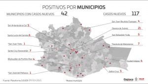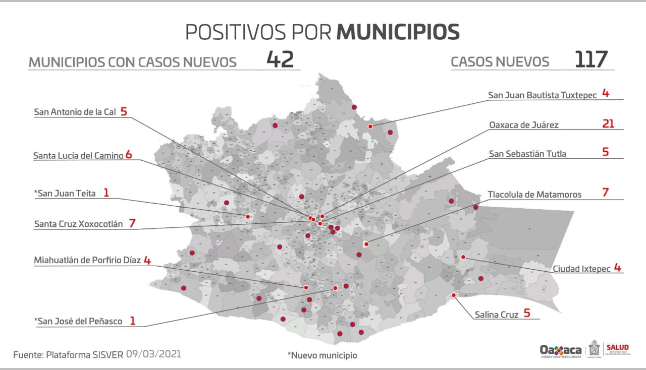 Los 117 casos nuevos se distribuyen en 42 municipios, siendo los que mayor número de casos presentan el de Oaxaca de Juárez con 21, Santa Cruz Xoxocotlán y Tlacolula de Matamoros siete, Santa Lucía del Camino seis; San Sebastián Tutla, San Antonio de Cal y Salina Cruz cinco cada uno; Miahuatlán de Porfirio Díaz, Villa de Zaachila, San Juan Bautista Tuxtepec y Ciudad Ixtepec cuatro cada uno; el resto tres, dos y un caso.