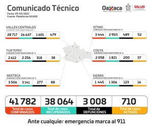 Informó que la Jurisdicción Sanitaria número uno Valles Centrales registra 28 mil 717 casos confirmados y mil 601 defunciones, Istmo tres mil 444 y 489 decesos, Tuxtepec dos mil 612 y 318 muertes, Costa dos mil 058 y 200 pérdidas humanas, Mixteca tres mil 506 y 277 fallecimientos y la Sierra mil 445 y 123 defunciones.