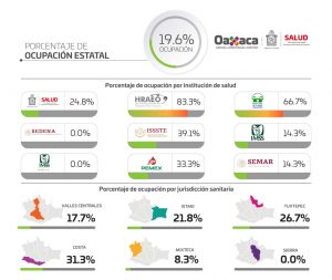 Referente a la ocupación hospitalaria global, este día es del 19.6% la Jurisdicción Sanitaria número uno Valles Centrales, ocupa el 17.7%, Istmo 21.8%, Tuxtepec 26.7%, Costa 31.3%, Mixteca 8.3% y la Sierra cero.