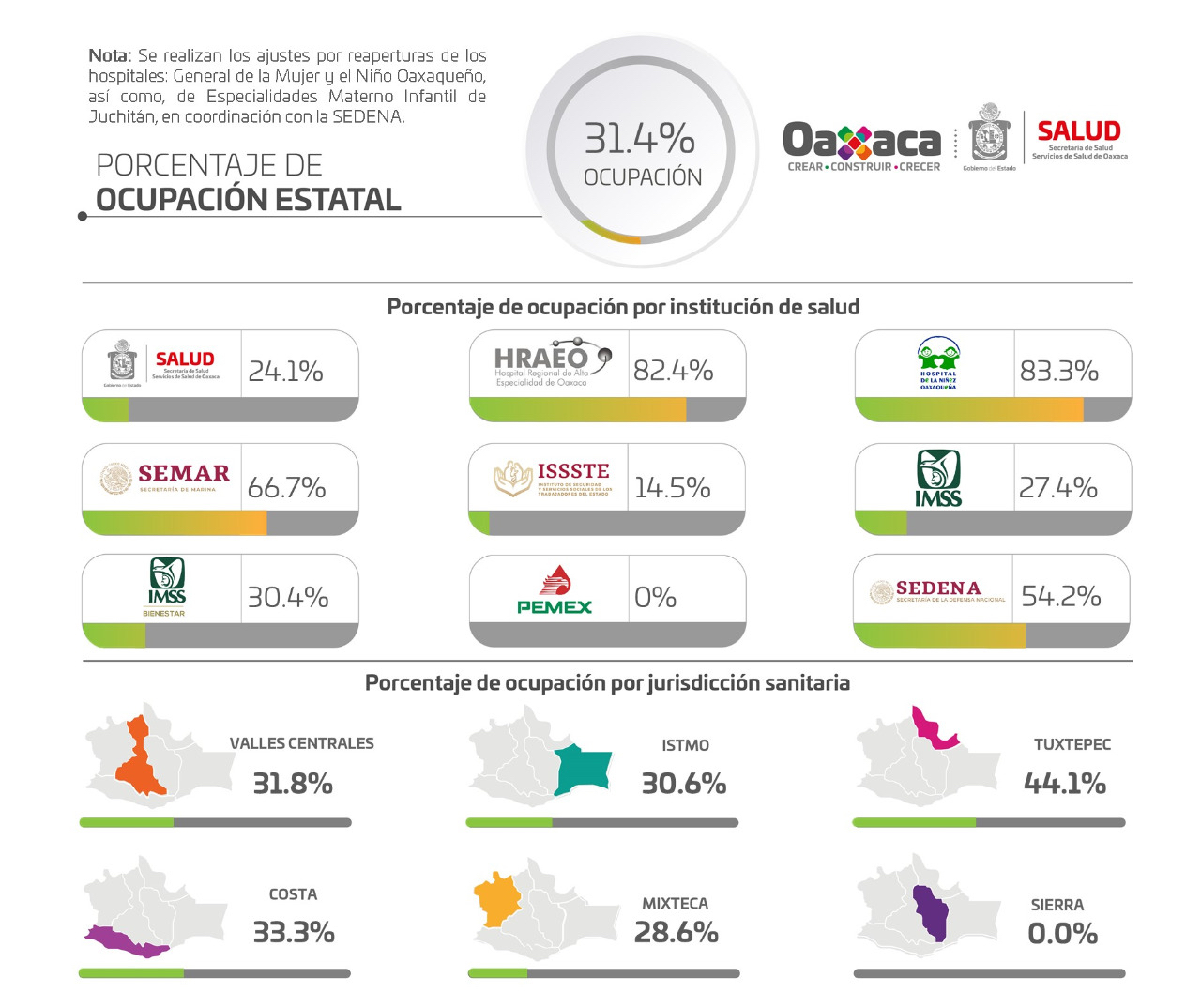 Este miércoles, cinco hospitales se encuentran al 100% de ocupación, y en las últimas 24 horas se notificó el ingreso de nueve personas a la red hospitalaria para un total de 130 pacientes hospitalizados y se encuentran disponibles 284 camas. Cabe destacar que Tuxtepec registra el 44.1% de ocupación, seguido de la Costa con 33.3%, Valles Centrales 31.8%, Istmo 30.6% y Mixteca 28.6%.