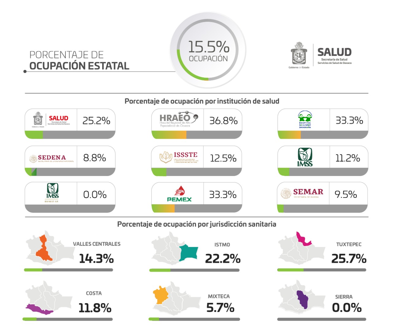 En relación a la ocupación hospitalaria por Jurisdicción Sanitaria, Valles Centrales registra un 14.3%, Istmo 22.2%, Tuxtepec 25.7%, Costa 11.8%, Mixteca 5.7% y Sierra 7.7%.