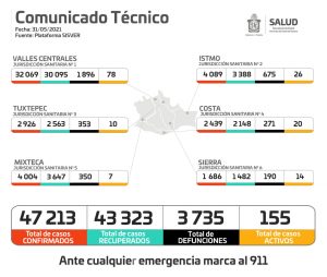 Oaxaca de Juárez, Oax. 31 de mayo de 2021.- Los Servicios de Salud de Oaxaca (SSO), informan que del 29 al 31 de mayo se registraron 45 casos nuevos de COVID-19, y tres defunciones; sumando 47 mil 213 casos acumulados y tres mil 735 fallecimientos.