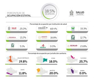 Referente a la ocupación hospitalaria, en la Jurisdicción Sanitaria número uno Valles Centrales se tiene una ocupación del 19.8%, Istmo 18 %, Tuxtepec 25.7%, Costa 11.8%, Mixteca 20% y la Sierra 0%.