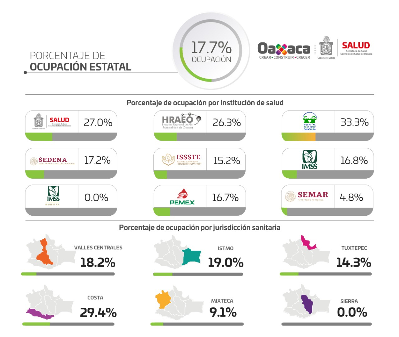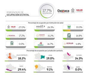 La Jurisdicción Sanitaria uno Valles Centrales, registra un 18.2% de camas ocupadas, Istmo 19%, Tuxtepec 14.3%, Costa 29.4%, Mixteca 9.1% y la Sierra cero.