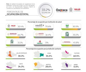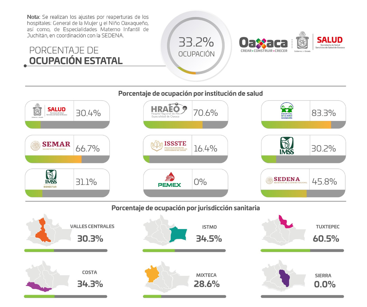 Asimismo, los SSO informan que la ocupación global es del 33.2%, con seis hospitales al 100% de saturación, siendo la Jurisdicción Sanitaria de Tuxtepec la que registra un 60.5%, seguido del Istmo con 34.5%, Costa 34.3%, Valles Centrales 30.3% y Mixteca 28.6%.