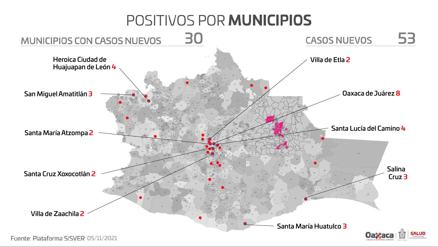 Los 53 casos nuevos se ubican en 30 municipios, siendo los principales Oaxaca de Juárez con ocho, Huajuapan de León y Santa Lucía del Camino cuatro cada uno; Salina Cruz, San Miguel Amatitlán y Santa María Huatulco tres cada uno; Santa Cruz Xoxocotlán, Santa María Atzompa, Villa de Etla y Villa de Zaachila dos casos cada uno; el resto un solo caso.