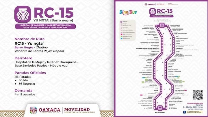 Por su parte la directora del BinniBus, Karina Gómez Esteban detalló que por el reordenamiento de trayectos se fusionan las rutas RC02 y RC04 para integrar la RC15 Hospital de la Mujer y la Niñez Oaxaqueña – Base Símbolos Patrios – Módulo Azul, denominada YU NGTA’, que significa Barro Negro en lengua chatina de Santos Reyes Nopala. Contará con 116 paradas oficiales, 60 de ida y 56 de regreso y operará en un horario de 6:30 a 22:00 horas.