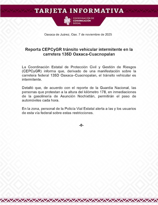 La Coordinación Estatal de Protección Civil y Gestión de Riesgos (CEPCyGR) informa que, derivado de una manifestación sobre la carretera federal 135D Oaxaca–Cuacnopalan, el tránsito vehicular es intermitente.