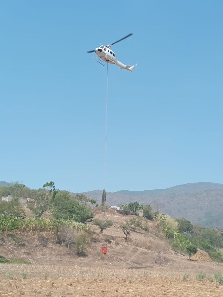 A las labores de combate se sumó la aeronave de la administración estatal BELL UH-1H, la cual realizó vuelos de reconocimiento para facilitar un ataque eficiente al fuego, así como descargas de agua en los frentes más activos de este incidente.