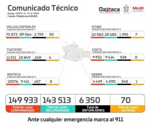 Por Jurisdicción Sanitaria, Valles Centrales contabiliza 50 casos activos, Mixteca ocho, Istmo siete, Tuxtepec cuatro, Sierra uno y Costa cero, para un total de 70 pacientes.