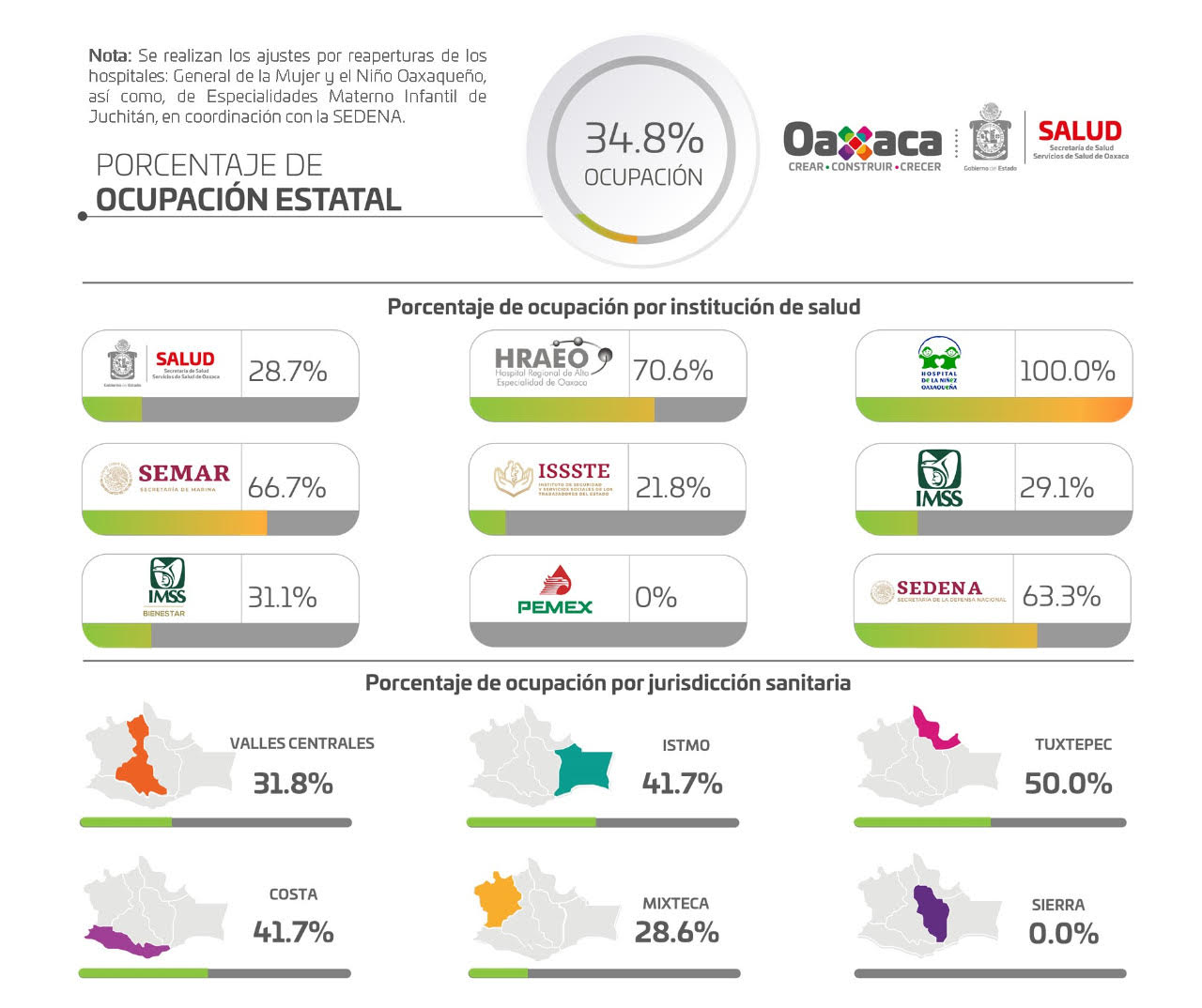 En tanto, la red hospitalaria para COVID-19 en Oaxaca, se encuentra de manera general al 34.8% de ocupación, ya que durante la última jornada se reportaron tres nuevos ingresos, para un total de 146 personas que se encuentran recibiendo atención especializada.