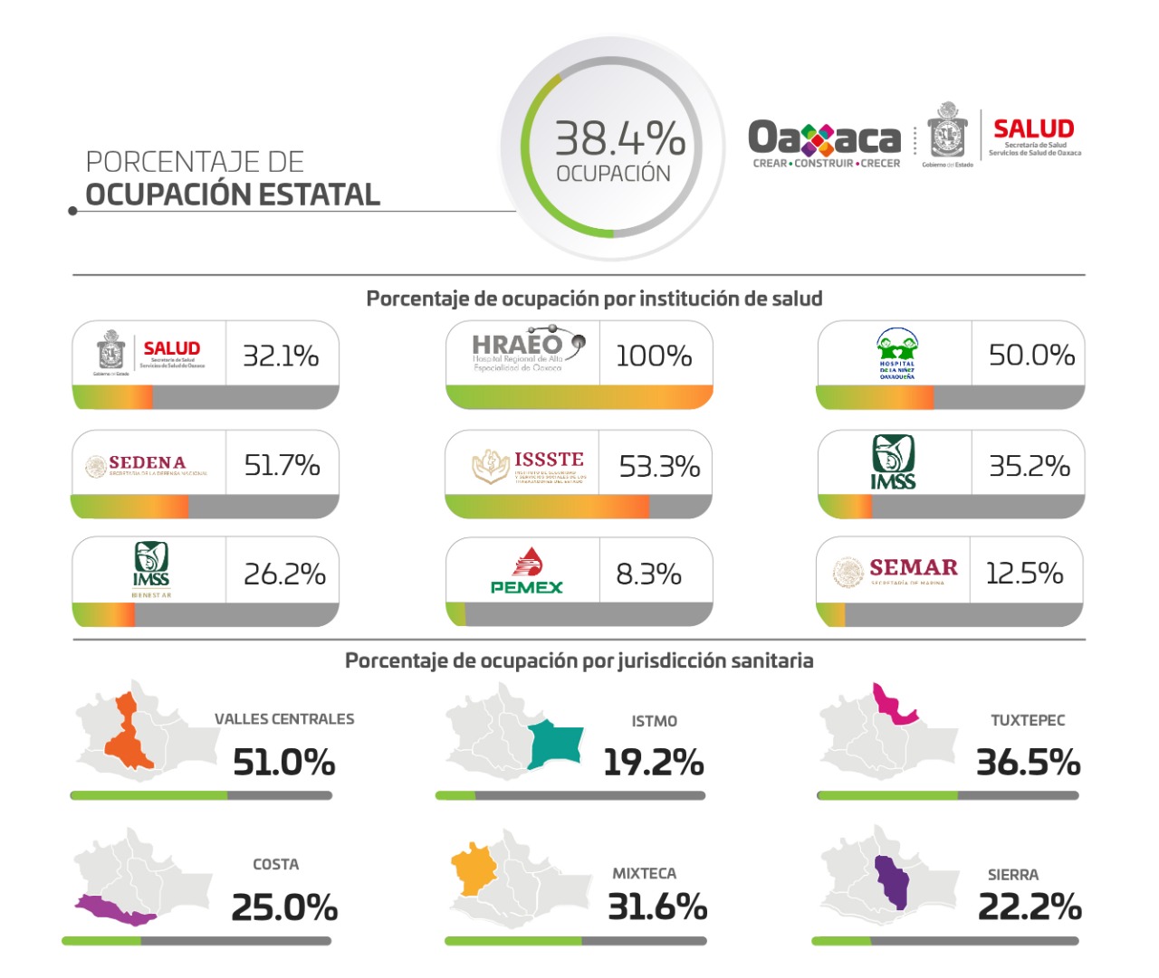 Por Jurisdicción Sanitaria, agregó que Valles Centrales contabilizó el 51% de saturación hospitalaria, Istmo 19.2%, Tuxtepec 36.5%, Costa 25%, Mixteca 31.6% y Sierra 22.2%.
