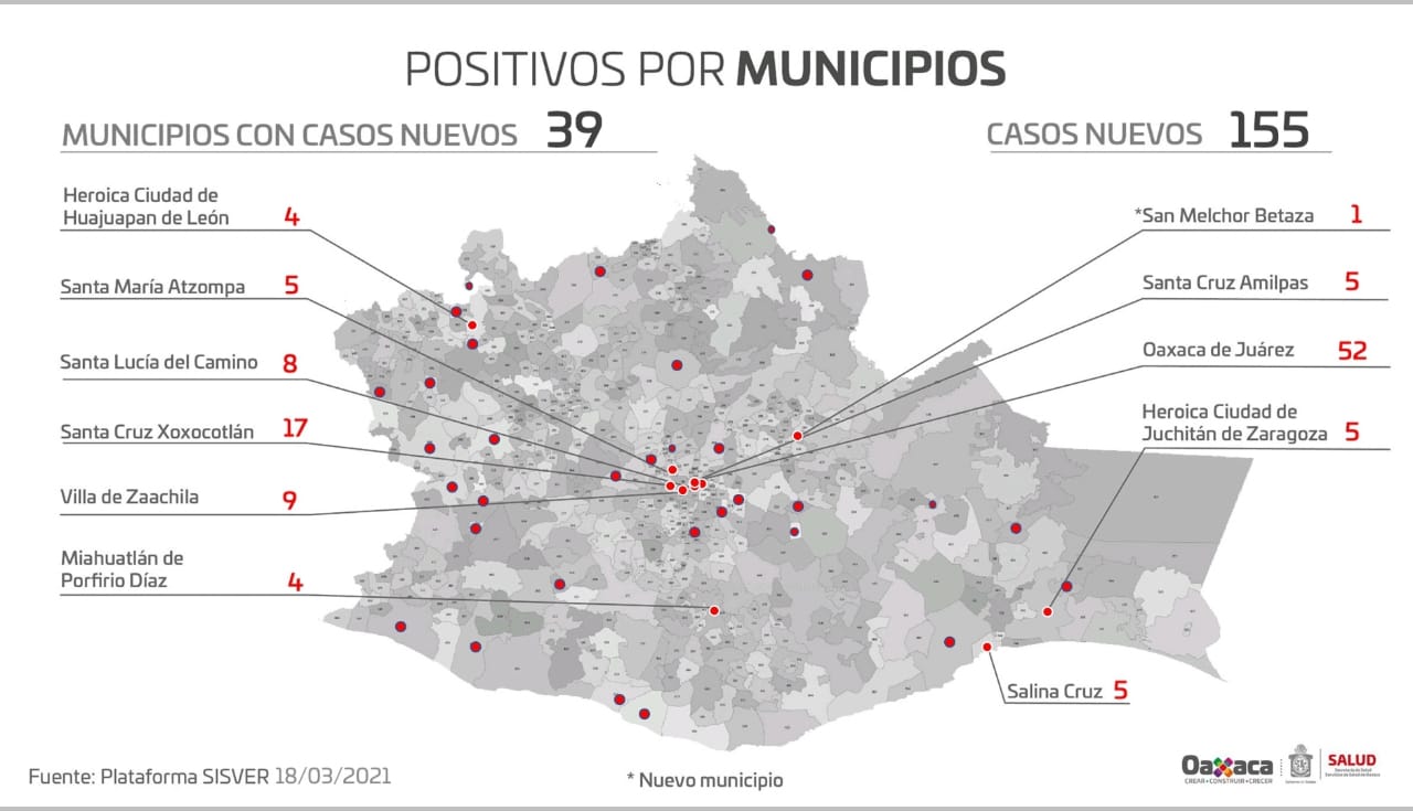 El funcionario indicó que los 155 pacientes nuevos notificados este jueves, pertenecen a 39 municipios; las zonas urbanas continúan concentrando la mayor incidencia, principalmente Oaxaca de Juárez con 52 casos, Santa Cruz Xoxocotlán con 17, Villa de Zaachila con nueve y Santa Lucía del Camino con ocho, el resto cinco, cuatro, tres, dos y uno. El ayuntamiento de San Melchor Betaza reporta por primera vez un contagio.