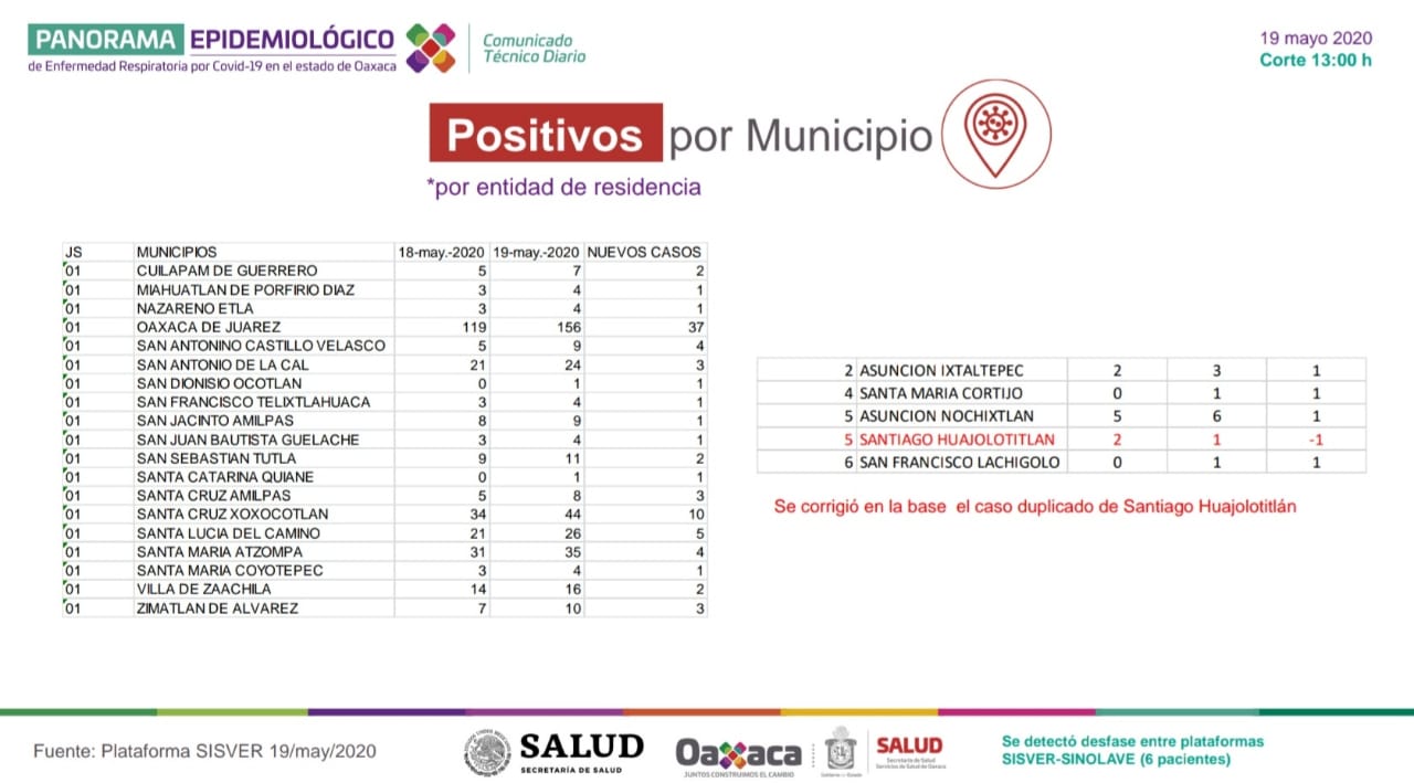 Oaxaca de Juárez, Oax. 19 de mayo de 2020. Con la Jurisdicción Sanitaria de Valles Centrales a la cabeza en casos positivos a COVID-19, los Servicios de Salud de Oaxaca (SSO) confirmaron este martes 19 de mayo, 86 nuevos pacientes del nuevo coronavirus, sumando un total de 692 positivos y 79 defunciones en todo el estado.
