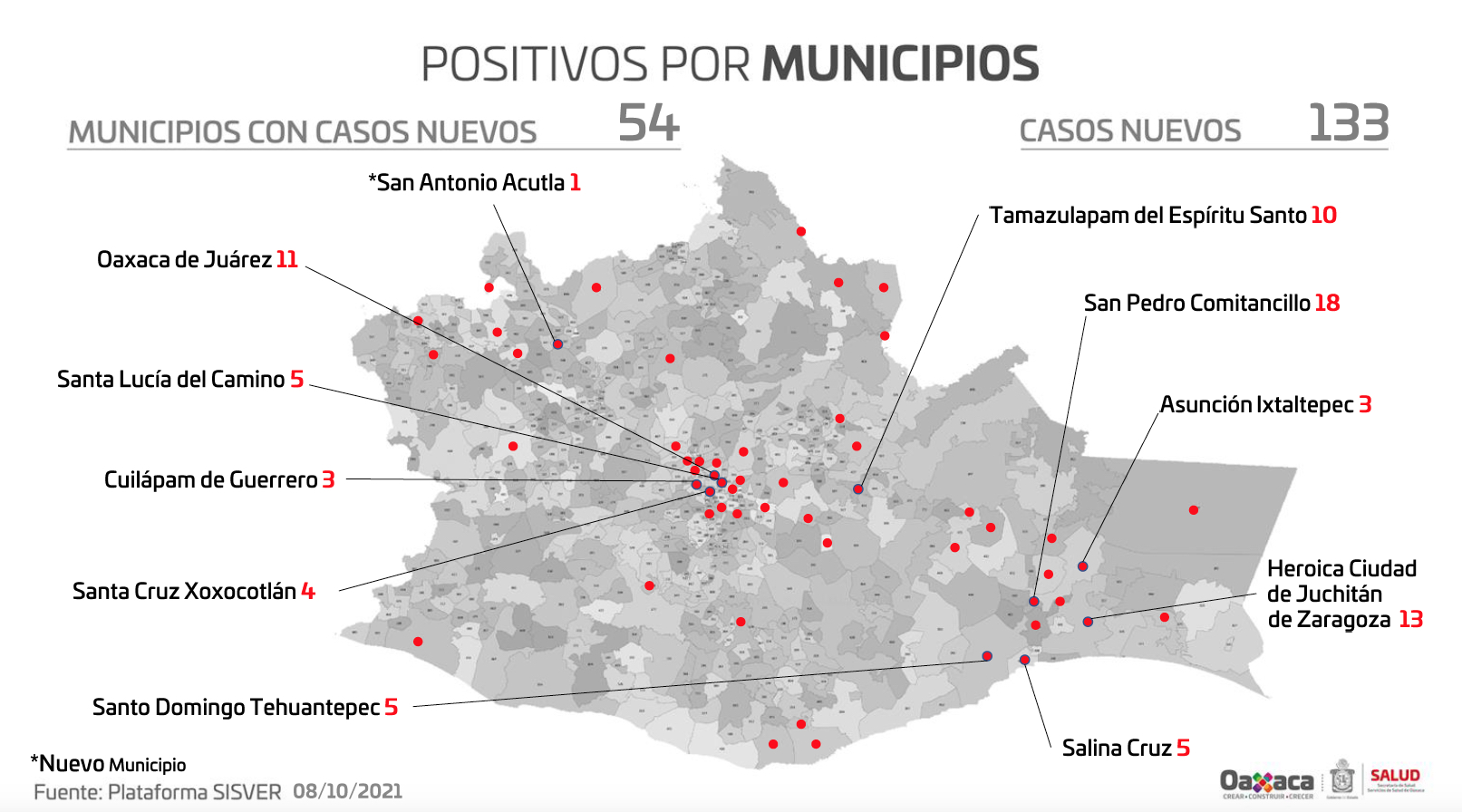 Los 133 casos nuevos, afectan a 54 municipios siendo el primer lugar, San Pedro Comitancillo con 18 casos, Juchitán de Zaragoza con 13, Oaxaca de Juárez 11, Tamazulápam del Espíritu Santo 10, Salina Cruz, Santa Lucía del Camino y Santo Domingo Tehuantepec cinco cada uno, Santa Cruz Xoxocotlán cuatro, el resto de tres a un solo caso.