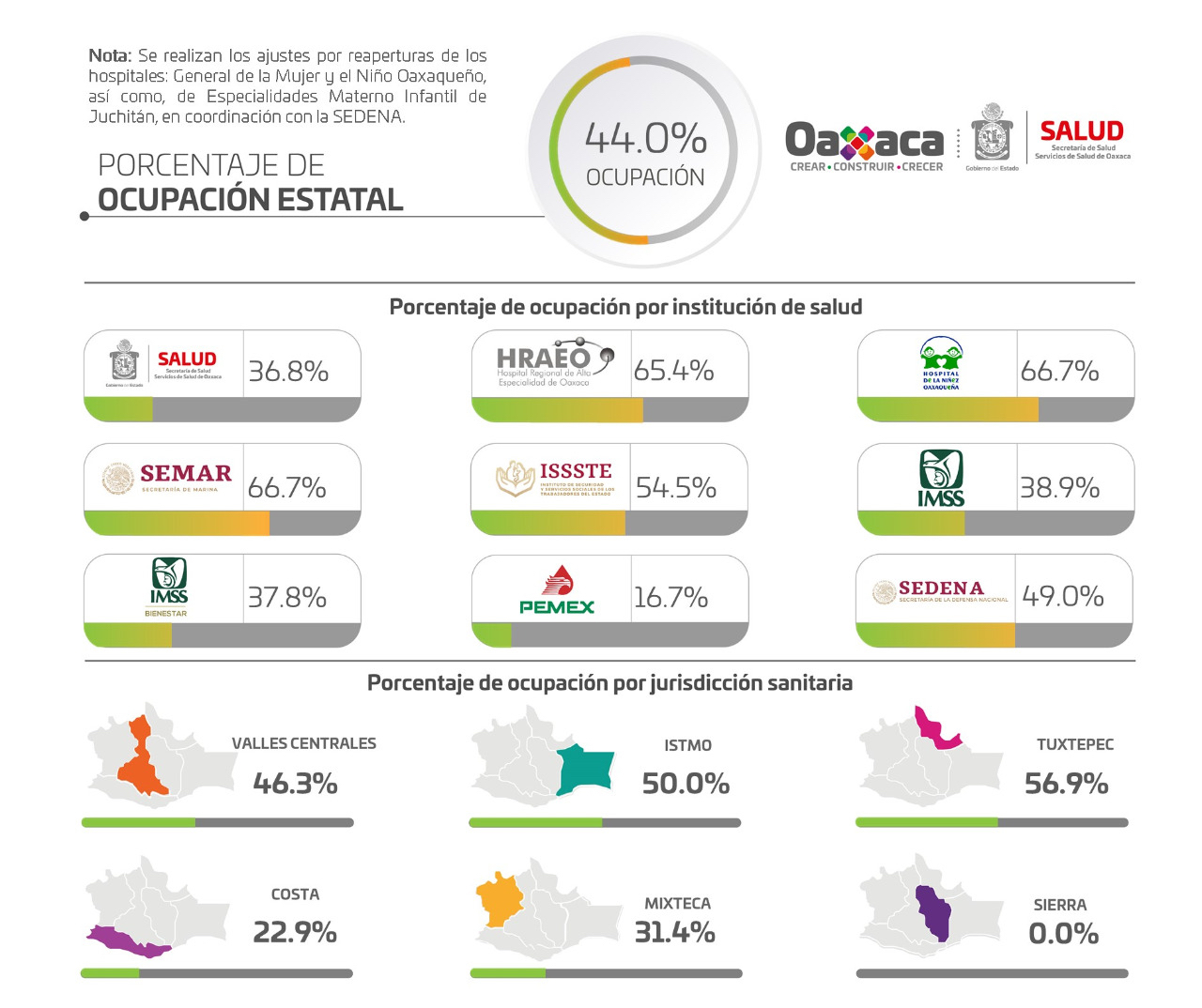 En relación a la ocupación hospitalaria por Jurisdicción Sanitaria, Tuxtepec registra un 56.9%, Istmo 50%, Valles Centrales 46.3%, Mixteca 31.4% y Costa 22.9%.